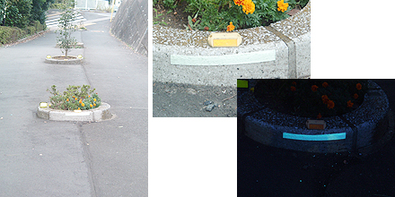 急勾配で幅の広い歩道です。センターに自転車のスピード制御を目的とした花壇が設けられています。夜間、人との接触事故回避のために反射板に加え高輝度・長残光のグローペイントを追加施工しました。